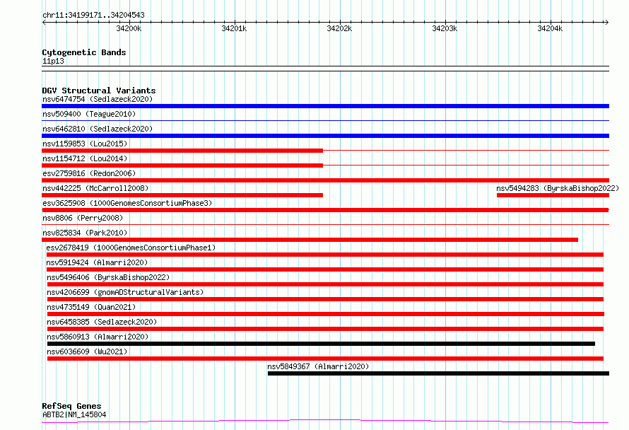 Variant DetailsVariant: esv3625908| Internal ID | 7012742 | | Landmark | | | Location Information | | | Cytoband | 11p13 | | Allele length | | Assembly | Allele length | | hg38 | 5373 | | hg19 | 5373 |