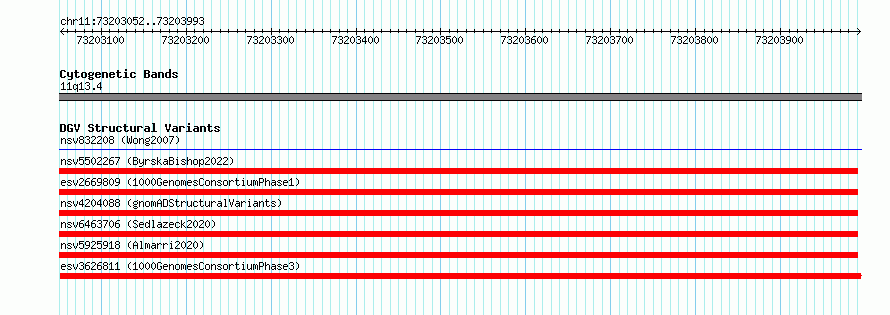 Variant DetailsVariant: esv3626811 | Internal ID | 7013641 | | Landmark | | | Location Information | | | Cytoband | 11q13.4 | | Allele length | | Assembly | Allele length | | hg38 | 942 | | hg19 | 942 |