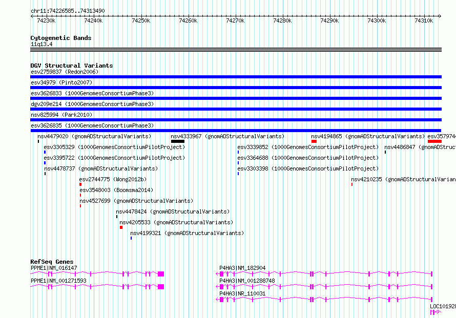 | | Variant Type | CNV gain | | Copy Number | | | Allele State | | | Allele Origin | | | Probe Count | | | Validation Flag | | | Merged Status | M | | Merged Variants | | | Supporting Variants | essv14212845 | | Samples | NA18582 | | Known Genes | P4HA3, PPME1 | | Method | Sequencing | | Analysis | | | Platform | Multiple platforms | | Comments | | | Reference | 1000_Genomes_Consortium_Phase_3 | | Pubmed ID | 21293372 | | Accession Number(s) | esv3626835
