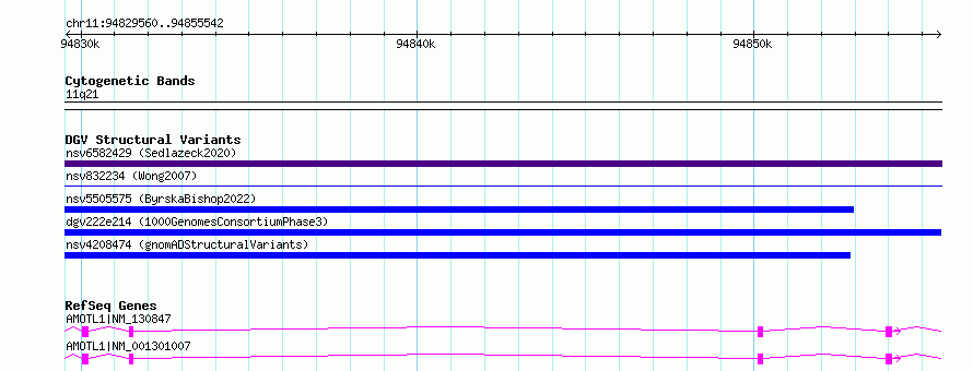 Variant DetailsVariant: esv3627330| Internal ID | 7014160 | | Landmark | | | Location Information | | | Cytoband | 11q21 | | Allele length | | Assembly | Allele length | | hg38 | 25983 | | hg19 | 25982 |