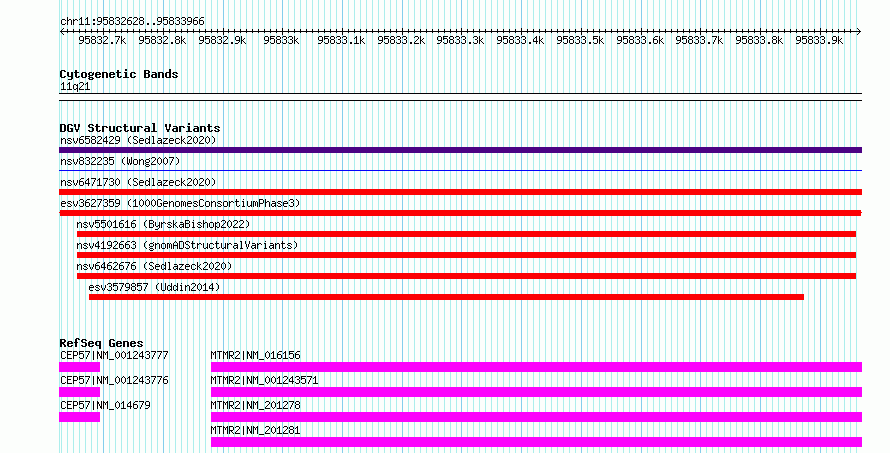 Variant DetailsVariant: esv3627359| Internal ID | 7014189 | | Landmark | | | Location Information | | | Cytoband | 11q21 | | Allele length | | Assembly | Allele length | | hg38 | 1339 | | hg19 | 1339 |