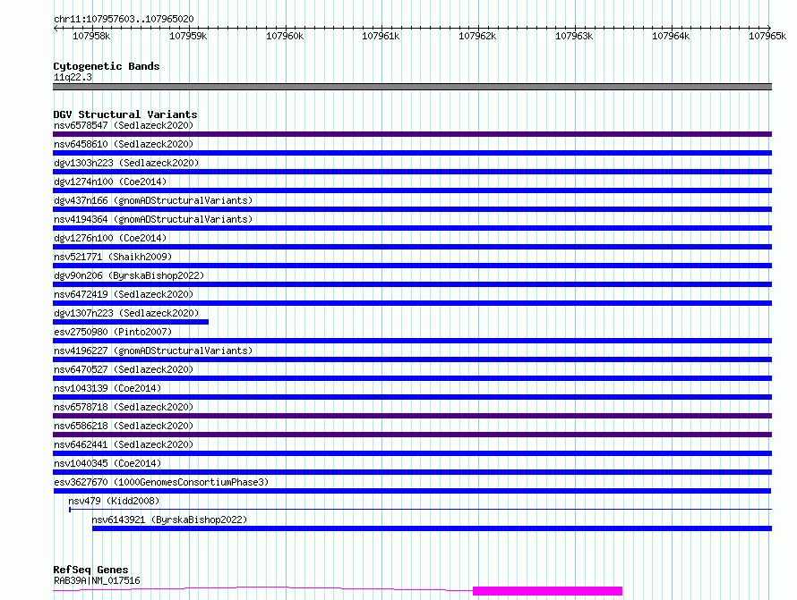 Variant DetailsVariant: esv3627670| Internal ID | 7014498 | | Landmark | | | Location Information | | | Cytoband | 11q22.3 | | Allele length | | Assembly | Allele length | | hg38 | 7418 | | hg19 | 7418 |