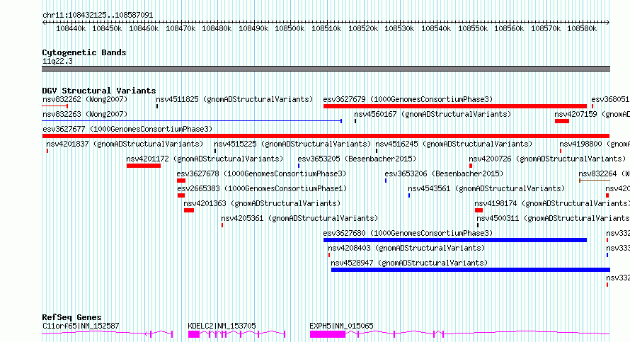 Variant DetailsVariant: esv3627677| Internal ID | 6667824 | | Landmark | | | Location Information | | | Cytoband | 11q22.3 | | Allele length | | Assembly | Allele length | | hg38 | 154967 | | hg19 | 154967 |