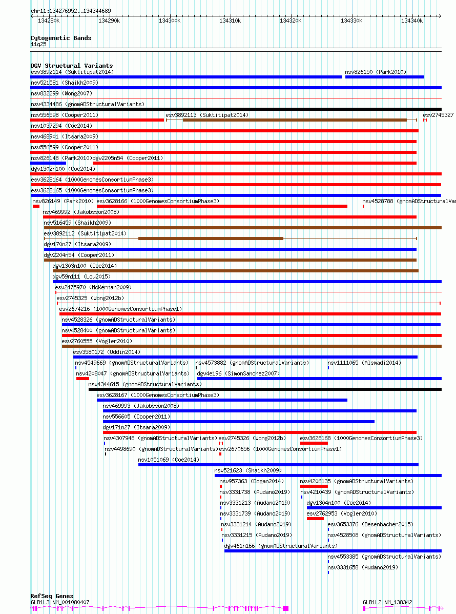 Variant DetailsVariant: esv3628165| Internal ID | 6668309 | | Landmark | | | Location Information | | | Cytoband | 11q25 | | Allele length | | Assembly | Allele length | | hg38 | 67738 | | hg19 | 67738 |