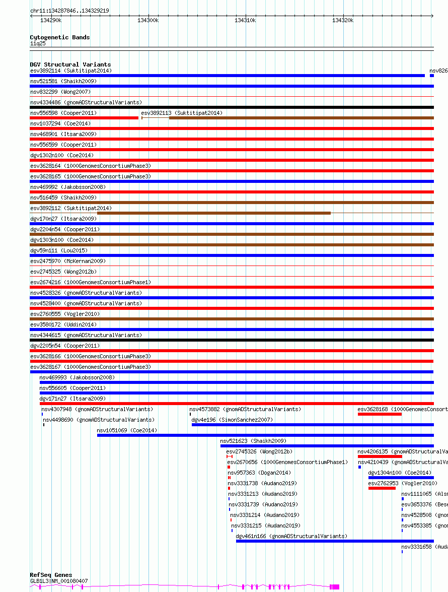Variant DetailsVariant: esv3628167| Internal ID | 6668311 | | Landmark | | | Location Information | | | Cytoband | 11q25 | | Allele length | | Assembly | Allele length | | hg38 | 41374 | | hg19 | 41374 |