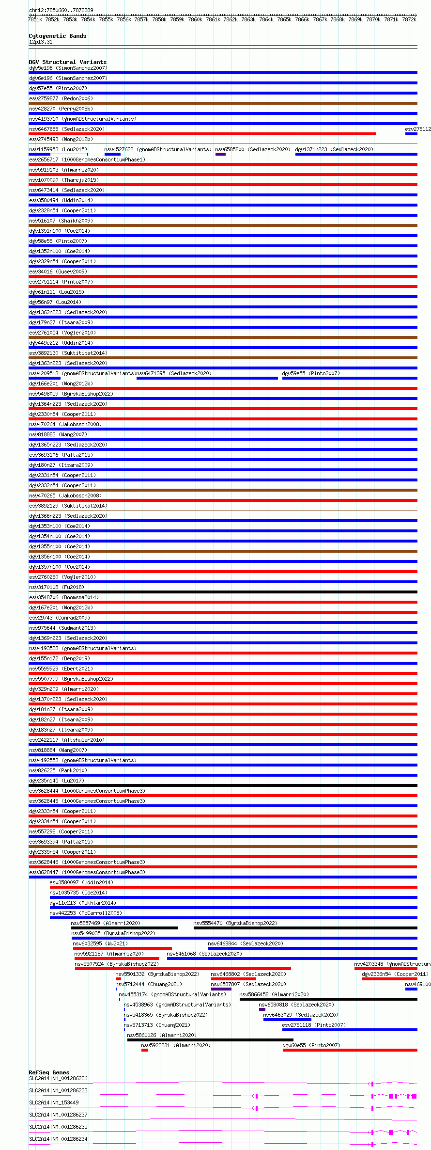 Variant DetailsVariant: esv3628446| Internal ID | 7015270 | | Landmark | | | Location Information | | | Cytoband | 12p13.31 | | Allele length | | Assembly | Allele length | | hg38 | 21730 | | hg19 | 21730 |