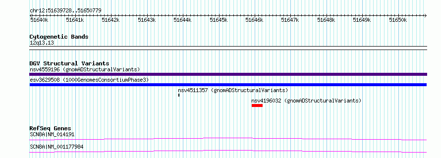| | Variant Type | CNV gain | | Copy Number | | | Allele State | | | Allele Origin | | | Probe Count | | | Validation Flag | | | Merged Status | M | | Merged Variants | | | Supporting Variants | essv14481123, essv14481122 | | Samples | HG03800, HG01668 | | Known Genes | SCN8A | | Method | Sequencing | | Analysis | | | Platform | Multiple platforms | | Comments | | | Reference | 1000_Genomes_Consortium_Phase_3 | | Pubmed ID | 21293372 | | Accession Number(s) | esv3629508