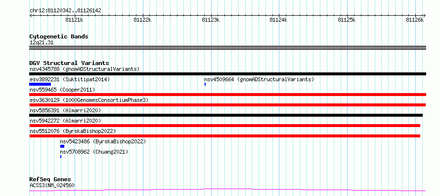 | | Variant Type | CNV loss | | Copy Number | | | Allele State | | | Allele Origin | | | Probe Count | | | Validation Flag | | | Merged Status | M | | Merged Variants | | | Supporting Variants | essv14549913, essv14549912, essv14549911, essv14549914, essv14549910 | | Samples | HG04210, NA20853, HG04070, NA20866, HG04006 | | Known Genes | ACSS3 | | Method | Sequencing | | Analysis | | | Platform | Multiple platforms | | Comments | | | Reference | 1000_Genomes_Consortium_Phase_3 | | Pubmed ID | 21293372 | | Accession Number(s) | esv3630129
