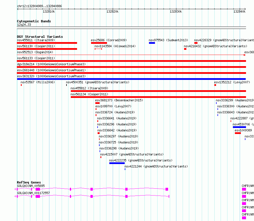 | Variant Type | CNV gain | Copy Number | | Allele State | | Allele Origin | | Probe Count | | Validation Flag | | Merged Status | M | Merged Variants | | Supporting Variants | essv14649907 | Samples | NA18934 | Known Genes | CHFR, GOLGA3 | Method | Sequencing | Analysis | | Platform | Multiple platforms | Comments | | Reference | 1000_Genomes_Consortium_Phase_3 | Pubmed ID | 21293372 | Accession Number(s) | esv3631320