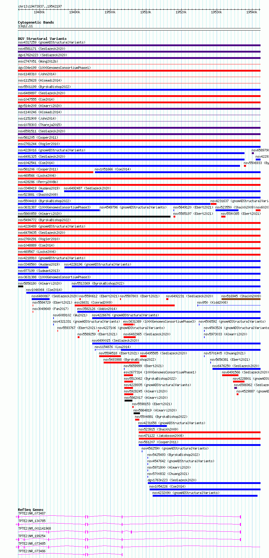 Variant DetailsVariant: esv3631388| Internal ID | 7018197 | | Landmark | | | Location Information | | | Cytoband | 13q12.11 | | Allele length | | Assembly | Allele length | | hg38 | 68261 | | hg19 | 68261 |