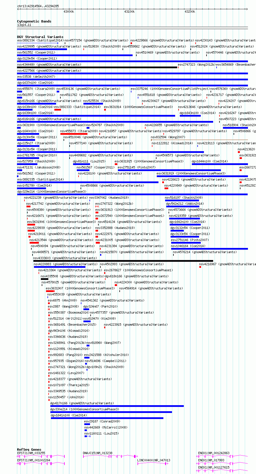 Variant DetailsVariant: esv3631904| Internal ID | 6672029 | | Landmark | | | Location Information | | | Cytoband | 13q14.11 | | Allele length | | Assembly | Allele length | | hg38 | 379722 | | hg19 | 379722 |