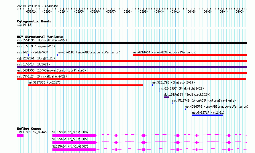 Variant DetailsVariant: esv3631956| Internal ID | 7018766 | | Landmark | | | Location Information | | | Cytoband | 13q14.13 | | Allele length | | Assembly | Allele length | | hg38 | 14343 | | hg19 | 14343 |