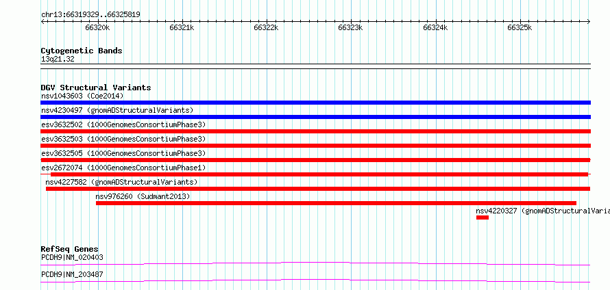 | | Variant Type | CNV loss | | Copy Number | | | Allele State | | | Allele Origin | | | Probe Count | | | Validation Flag | | | Merged Status | M | | Merged Variants | | | Supporting Variants | essv14777490, essv14777505, essv14777509, essv14777500, essv14777511, essv14777495, essv14777498, essv14777496, essv14777510, essv14777501, essv14777503, essv14777513, essv14777497, essv14777512, essv14777499, essv14777506, essv14777494, essv14777489, essv14777502, essv14777514, essv14777493, essv14777508, essv14777492, essv14777507, essv14777488, essv14777504, essv14777491 | | Samples | HG03130, HG03521, HG03577, NA19107, HG03572, HG02621, HG03091, NA20278, NA19719, HG01950, NA18908, HG02442, HG03291, HG02953, HG03123, NA18879, HG03476, HG01988, HG00128, HG02557, HG03419, HG03063, HG03410, HG03401, NA19316, HG02284, HG02343 | | Known Genes | PCDH9 | | Method | Sequencing | | Analysis | | | Platform | Multiple platforms | | Comments | | | Reference | 1000_Genomes_Consortium_Phase_3 | | Pubmed ID | 21293372 | | Accession Number(s) | esv3632505