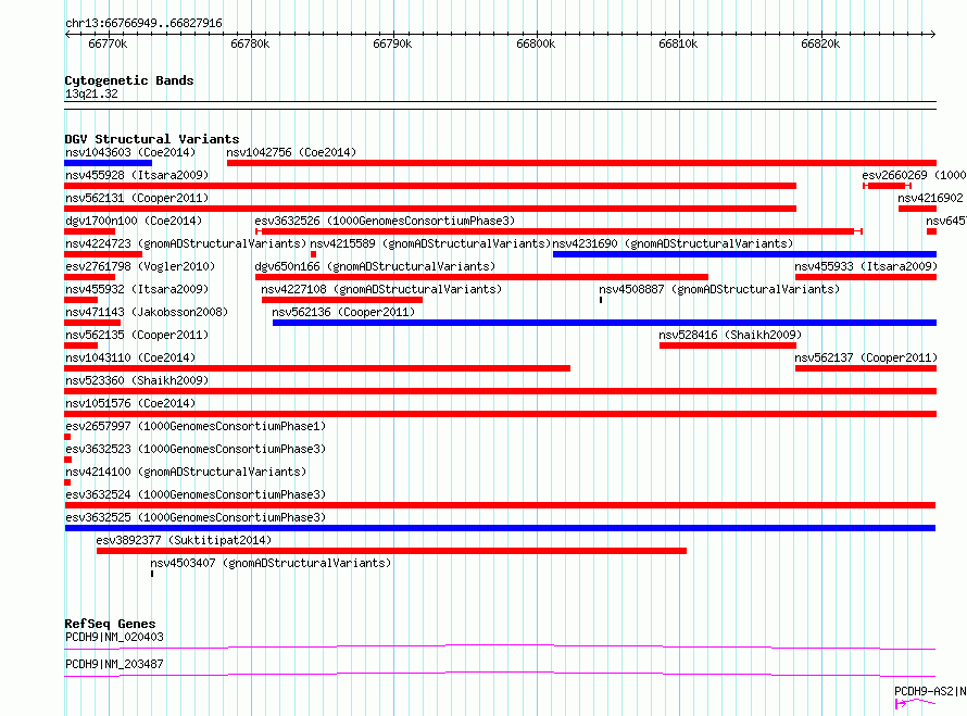 | | Variant Type | CNV gain | | Copy Number | | | Allele State | | | Allele Origin | | | Probe Count | | | Validation Flag | | | Merged Status | M | | Merged Variants | | | Supporting Variants | essv14778123 | | Samples | HG02253 | | Known Genes | PCDH9, PCDH9-AS2 | | Method | Sequencing | | Analysis | | | Platform | Multiple platforms | | Comments | | | Reference | 1000_Genomes_Consortium_Phase_3 | | Pubmed ID | 21293372 | | Accession Number(s) | esv3632525