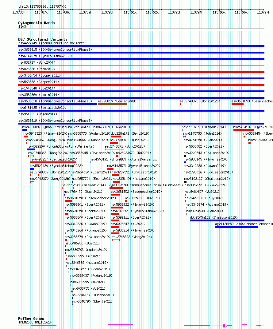 Variant DetailsVariant: esv3633619| Internal ID | 7020427 | | Landmark | | | Location Information | | | Cytoband | 13q34 | | Allele length | | Assembly | Allele length | | hg38 | 11035 | | hg19 | 11035 |