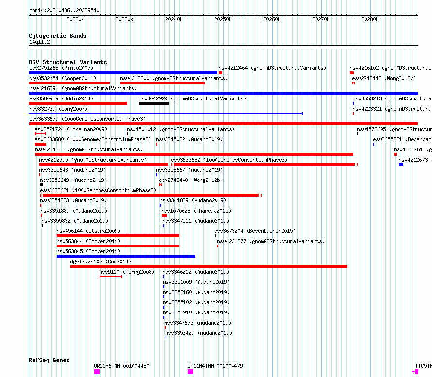 Variant DetailsVariant: esv3633679| Internal ID | 6673800 | | Landmark | | | Location Information | | | Cytoband | 14q11.2 | | Allele length | | Assembly | Allele length | | hg38 | 79055 | | hg19 | 79055 |