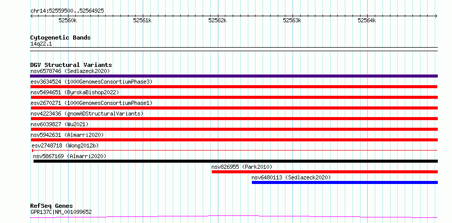 Variant DetailsVariant: esv3634524| Internal ID | 7021327 | | Landmark | | | Location Information | | | Cytoband | 14q22.1 | | Allele length | | Assembly | Allele length | | hg38 | 5426 | | hg19 | 5426 |
