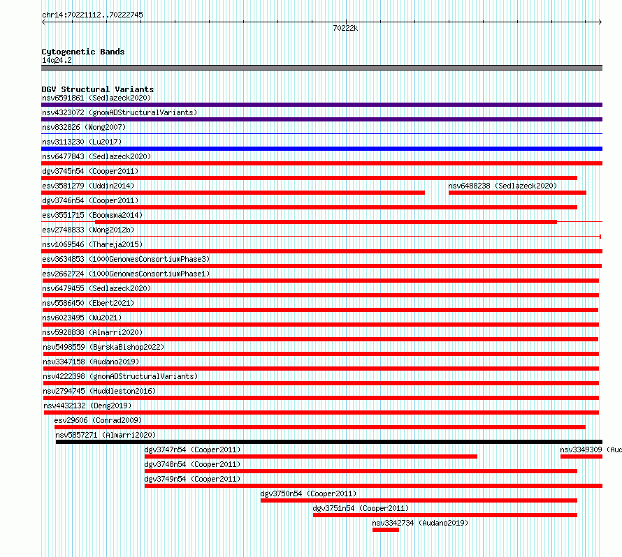 Variant DetailsVariant: esv3634853 | Internal ID | 7021653 | | Landmark | | | Location Information | | | Cytoband | 14q24.2 | | Allele length | | Assembly | Allele length | | hg38 | 1634 | | hg19 | 1634 |