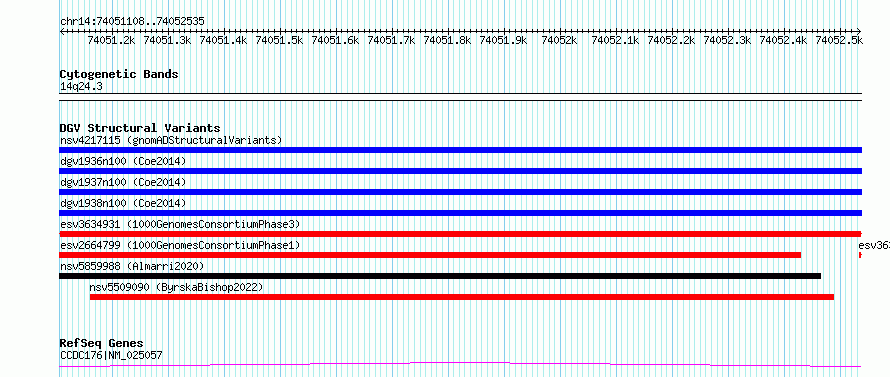 Variant DetailsVariant: esv3634931 | Internal ID | 7021731 | | Landmark | | | Location Information | | | Cytoband | 14q24.3 | | Allele length | | Assembly | Allele length | | hg38 | 1428 | | hg19 | 1428 |