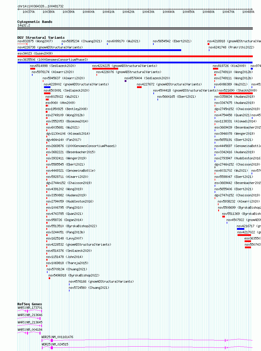 Variant DetailsVariant: esv3635506| Internal ID | 7022305 | | Landmark | | | Location Information | | | Cytoband | 14q32.2 | | Allele length | | Assembly | Allele length | | hg38 | 117405 | | hg19 | 117405 |