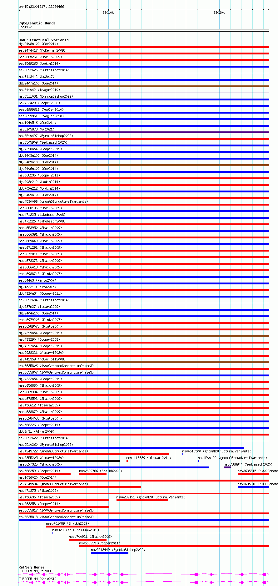 Variant DetailsVariant: esv3635818| Internal ID | 7022616 | | Landmark | | | Location Information | | | Cytoband | 15q11.2 | | Allele length | | Assembly | Allele length | | hg38 | 22550 | | hg19 | 22550 |