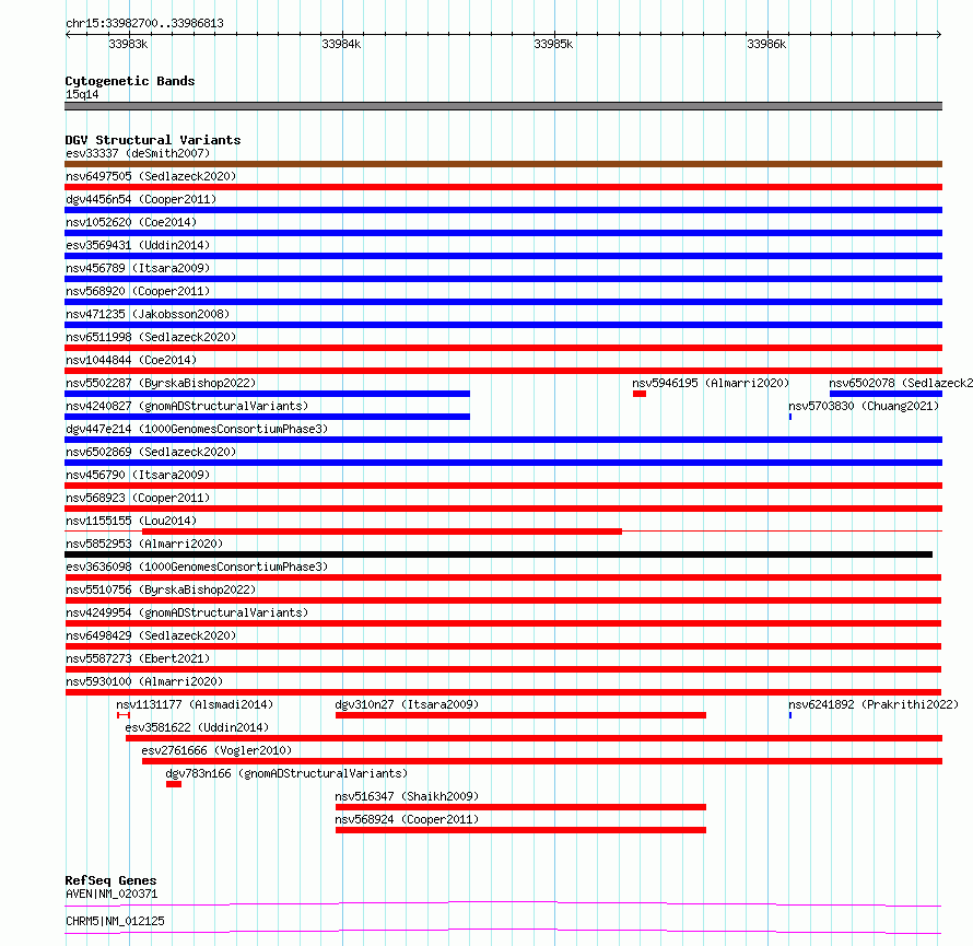 | | Variant Type | CNV loss | | Copy Number | | | Allele State | | | Allele Origin | | | Probe Count | | | Validation Flag | | | Merged Status | M | | Merged Variants | | | Supporting Variants | essv15210412, essv15210416, essv15210402, essv15210419, essv15210403, essv15210396, essv15210409, essv15210397, essv15210420, essv15210395, essv15210406, essv15210400, essv15210410, essv15210404, essv15210415, essv15210414, essv15210398, essv15210417, essv15210413, essv15210401, essv15210399, essv15210411, essv15210421, essv15210408, essv15210422, essv15210407, essv15210405, essv15210418 | | Samples | NA20877, HG02727, NA20864, HG03235, HG02733, NA21109, NA20889, NA21106, HG02793, HG03718, NA20885, NA20521, HG04195, HG02731, HG01880, HG03919, HG03742, NA20867, NA20866, NA21086, HG02649, HG03672, HG04118, HG04239, NA20897, NA20847, HG03998, HG03882 | | Known Genes | AVEN, CHRM5 | | Method | Sequencing | | Analysis | | | Platform | Multiple platforms | | Comments | | | Reference | 1000_Genomes_Consortium_Phase_3 | | Pubmed ID | 21293372 | | Accession Number(s) | esv3636098