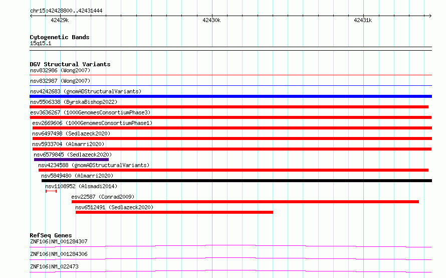 Variant DetailsVariant: esv3636267 | Internal ID | 7023063 | | Landmark | | | Location Information | | | Cytoband | 15q15.1 | | Allele length | | Assembly | Allele length | | hg38 | 2645 | | hg19 | 2645 |