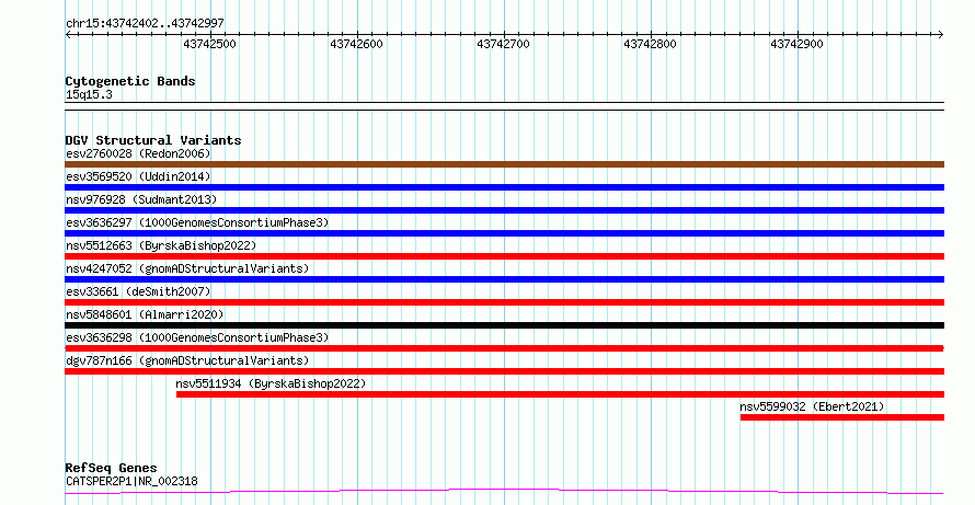 Variant DetailsVariant: esv3636298| Internal ID | 7023094 | | Landmark | | | Location Information | | | Cytoband | 15q15.3 | | Allele length | | Assembly | Allele length | | hg38 | 596 | | hg19 | 596 |