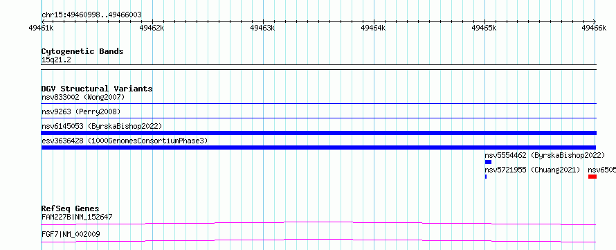 | | Variant Type | CNV gain | | Copy Number | | | Allele State | | | Allele Origin | | | Probe Count | | | Validation Flag | | | Merged Status | M | | Merged Variants | | | Supporting Variants | essv15245739 | | Samples | NA18966 | | Known Genes | FAM227B, FGF7 | | Method | Sequencing | | Analysis | | | Platform | Multiple platforms | | Comments | | | Reference | 1000_Genomes_Consortium_Phase_3 | | Pubmed ID | 21293372 | | Accession Number(s) | esv3636428