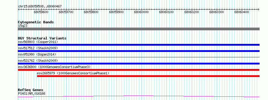 Variant DetailsVariant: esv3636800| Internal ID | 6676907 | | Landmark | | | Location Information | | | Cytoband | 15q23 | | Allele length | | Assembly | Allele length | | hg38 | 960 | | hg19 | 960 |