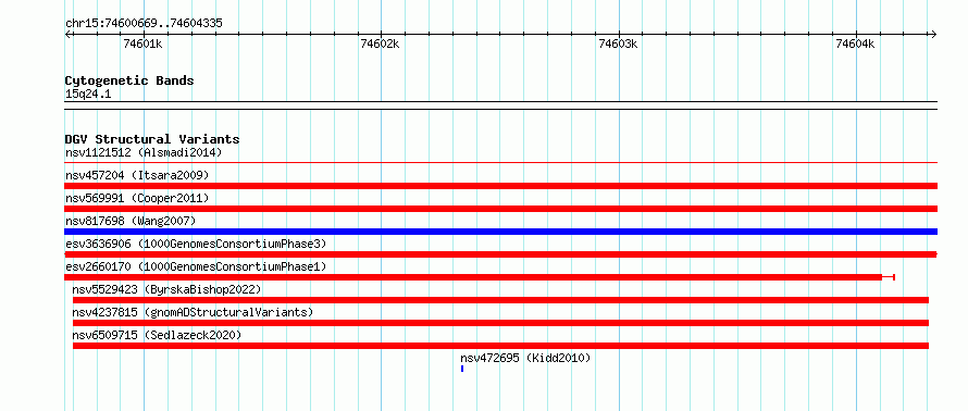 Variant DetailsVariant: esv3636906| Internal ID | 7023700 | | Landmark | | | Location Information | | | Cytoband | 15q24.1 | | Allele length | | Assembly | Allele length | | hg38 | 3667 | | hg19 | 3667 |