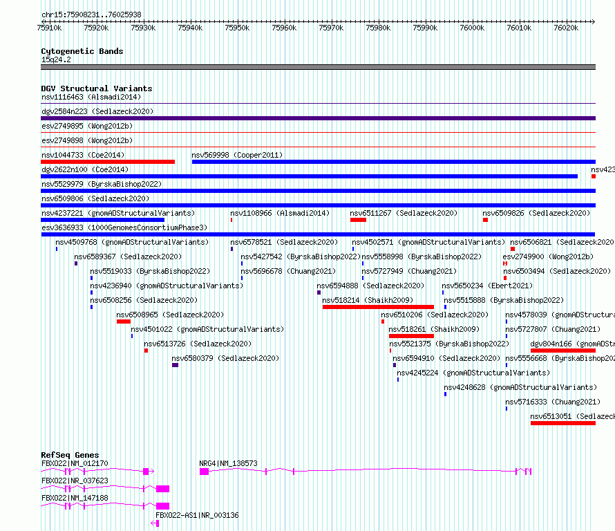 | | Variant Type | CNV gain | | Copy Number | | | Allele State | | | Allele Origin | | | Probe Count | | | Validation Flag | | | Merged Status | M | | Merged Variants | | | Supporting Variants | essv15293131 | | Samples | HG02816 | | Known Genes | FBXO22, FBXO22-AS1, NRG4 | | Method | Sequencing | | Analysis | | | Platform | Multiple platforms | | Comments | | | Reference | 1000_Genomes_Consortium_Phase_3 | | Pubmed ID | 21293372 | | Accession Number(s) | esv3636933
