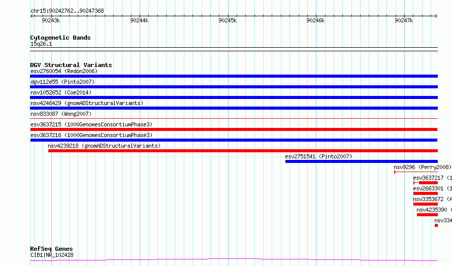 Variant DetailsVariant: esv3637216| Internal ID | 6677323 | | Landmark | | | Location Information | | | Cytoband | 15q26.1 | | Allele length | | Assembly | Allele length | | hg38 | 4607 | | hg19 | 4607 |