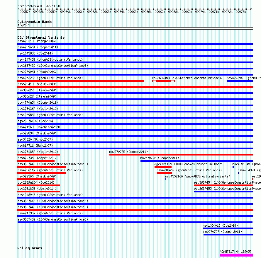 | Variant Type | CNV gain | Copy Number | | Allele State | | Allele Origin | | Probe Count | | Validation Flag | | Merged Status | M | Merged Variants | | Supporting Variants | essv15346486, essv15346483, essv15346485, essv15346487, essv15346482, essv15346484, essv15346481 | Samples | NA19028, NA19141, HG02678, NA19834, HG00620, HG04171, NA18488 | Known Genes | ADAMTS17 | Method | Sequencing | Analysis | | Platform | Multiple platforms | Comments | | Reference | 1000_Genomes_Consortium_Phase_3 | Pubmed ID | 21293372 | Accession Number(s) | esv3637452