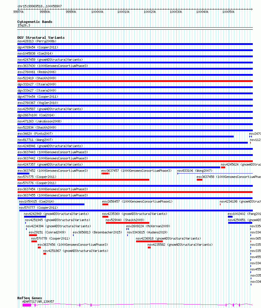 Variant DetailsVariant: esv3637455Internal ID | 6677559 | Landmark | | Location Information | | Cytoband | 15q26.3 | Allele length | Assembly | Allele length | hg38 | 89390 | hg19 | 89390 |