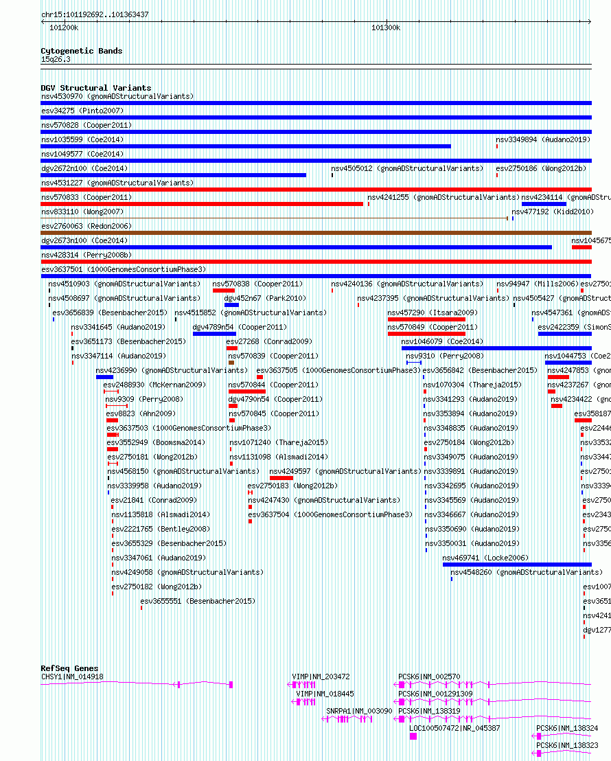| | Variant Type | CNV gain | | Copy Number | | | Allele State | | | Allele Origin | | | Probe Count | | | Validation Flag | | | Merged Status | M | | Merged Variants | | | Supporting Variants | essv15354134 | | Samples | NA12815 | | Known Genes | CHSY1, LOC100507472, PCSK6, SNRPA1, VIMP | | Method | Sequencing | | Analysis | | | Platform | Multiple platforms | | Comments | | | Reference | 1000_Genomes_Consortium_Phase_3 | | Pubmed ID | 21293372 | | Accession Number(s) | esv3637501