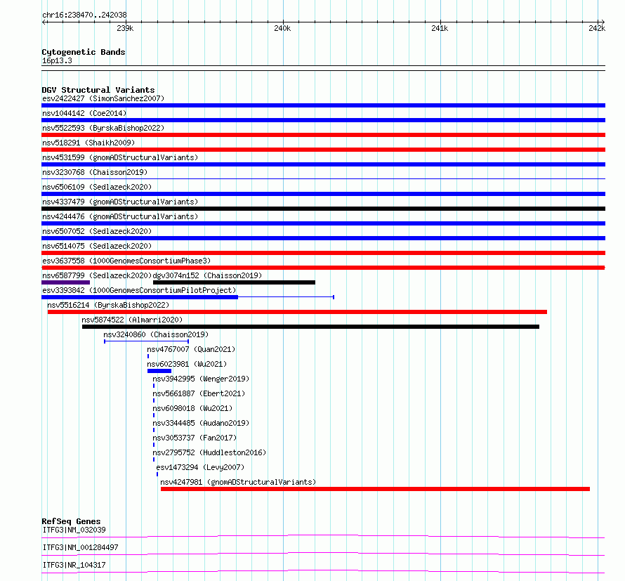 Variant DetailsVariant: esv3637558| Internal ID | 7024350 | | Landmark | | | Location Information | | | Cytoband | 16p13.3 | | Allele length | | Assembly | Allele length | | hg38 | 3569 | | hg19 | 3569 |
