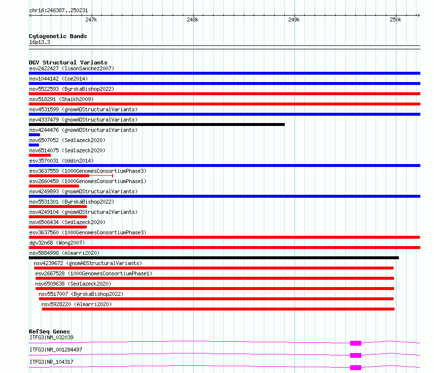 Variant DetailsVariant: esv3637560 | Internal ID | 7024352 | | Landmark | | | Location Information | | | Cytoband | 16p13.3 | | Allele length | | Assembly | Allele length | | hg38 | 3845 | | hg19 | 3845 |