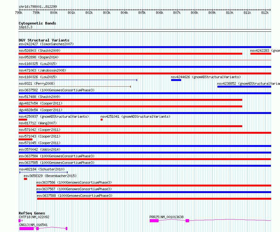 Variant DetailsVariant: esv3637585| Internal ID | 6677688 | | Landmark | | | Location Information | | | Cytoband | 16p13.3 | | Allele length | | Assembly | Allele length | | hg38 | 14299 | | hg19 | 14299 |