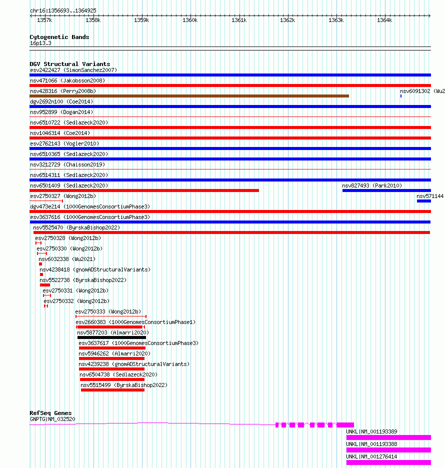 Variant DetailsVariant: esv3637616| Internal ID | 7024407 | | Landmark | | | Location Information | | | Cytoband | 16p13.3 | | Allele length | | Assembly | Allele length | | hg38 | 8233 | | hg19 | 8233 |