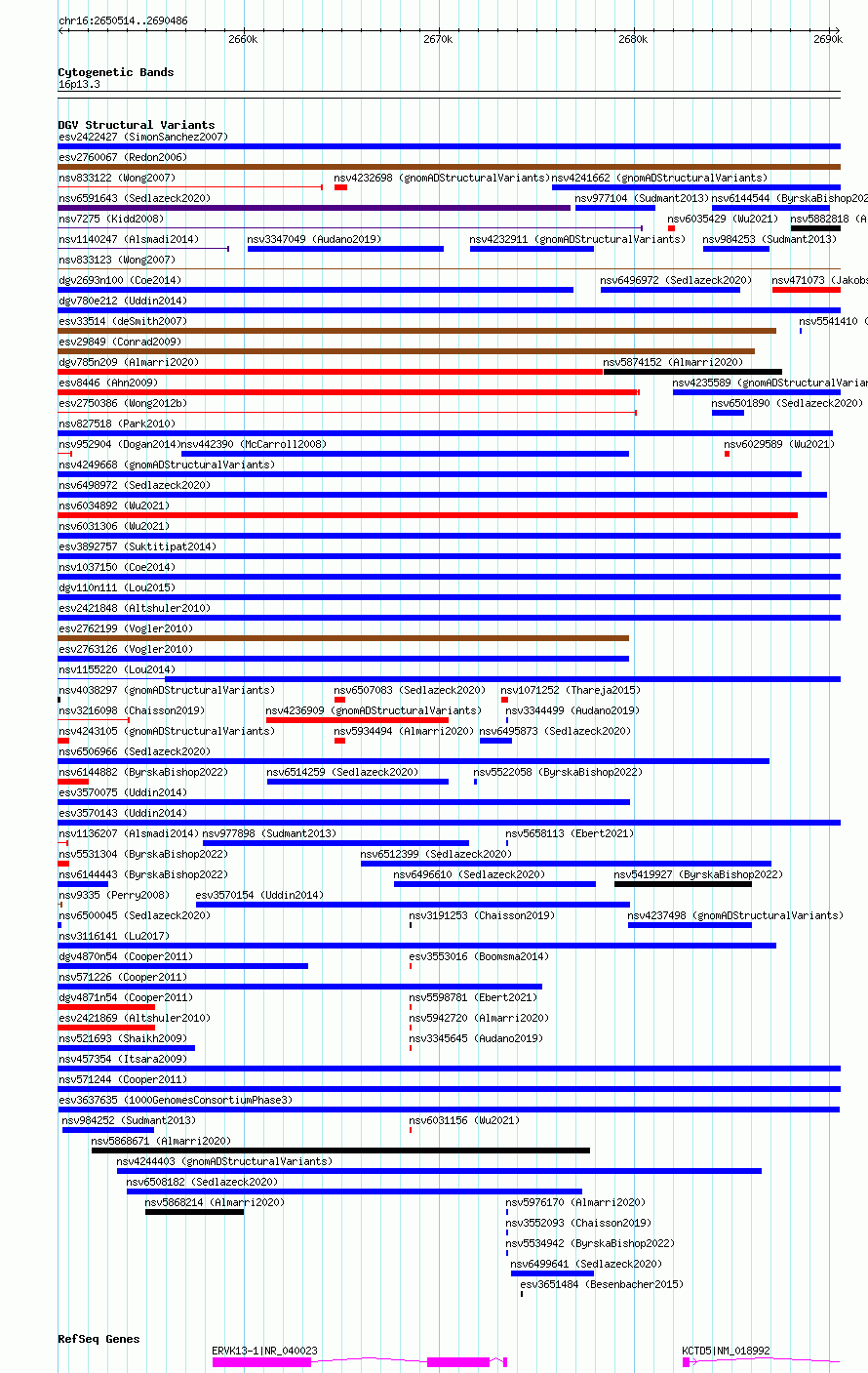 Variant DetailsVariant: esv3637635 | Internal ID | 7024426 | | Landmark | | | Location Information | | | Cytoband | 16p13.3 | | Allele length | | Assembly | Allele length | | hg38 | 39973 | | hg19 | 39973 |