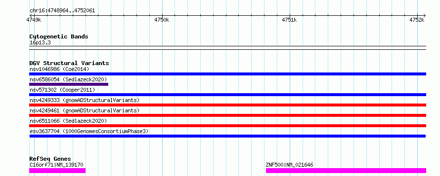 Variant DetailsVariant: esv3637704| Internal ID | 7024493 | | Landmark | | | Location Information | | | Cytoband | 16p13.3 | | Allele length | | Assembly | Allele length | | hg38 | 3098 | | hg19 | 3098 |