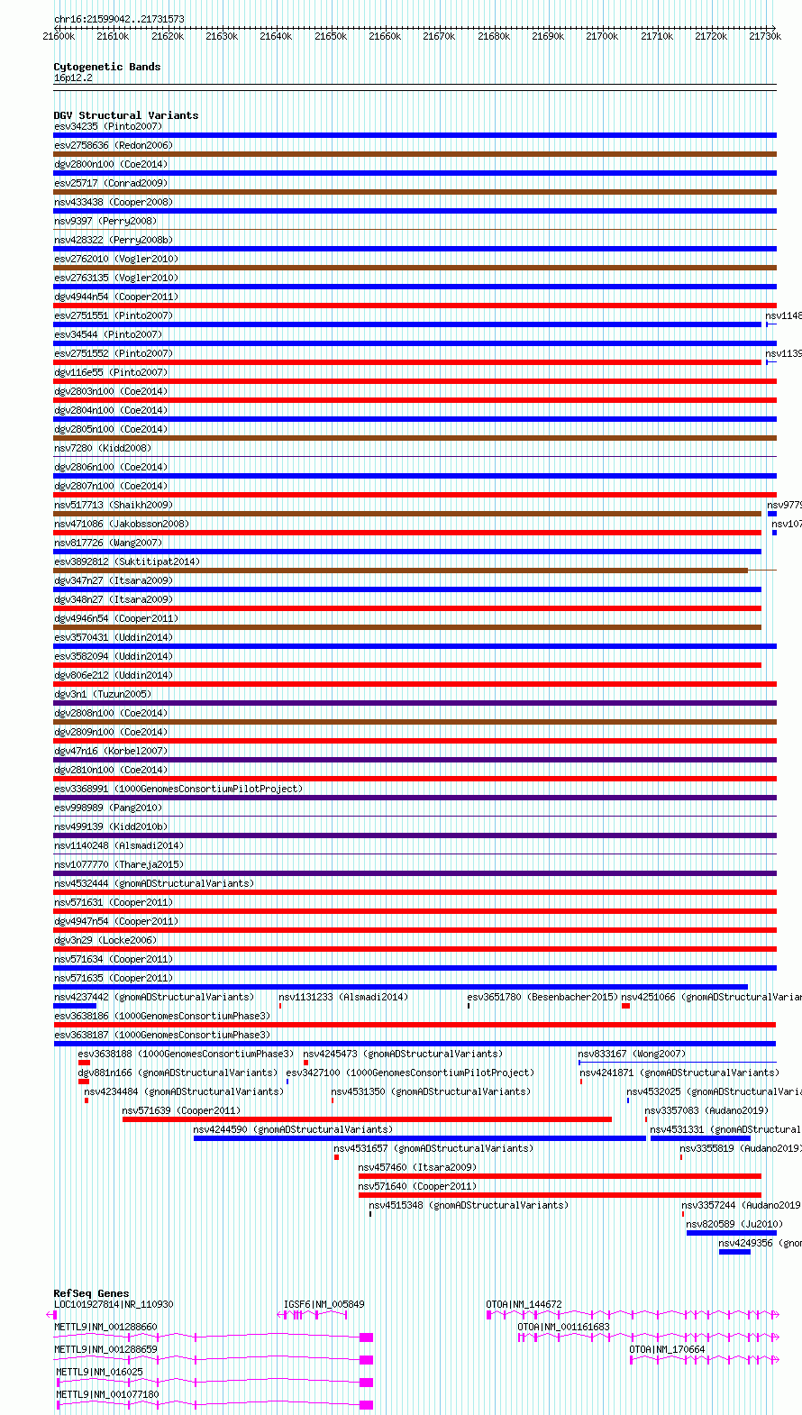 Variant DetailsVariant: esv3638187Internal ID | 6678285 | Landmark | | Location Information | | Cytoband | 16p12.2 | Allele length | Assembly | Allele length | hg38 | 132532 | hg19 | 132532 |