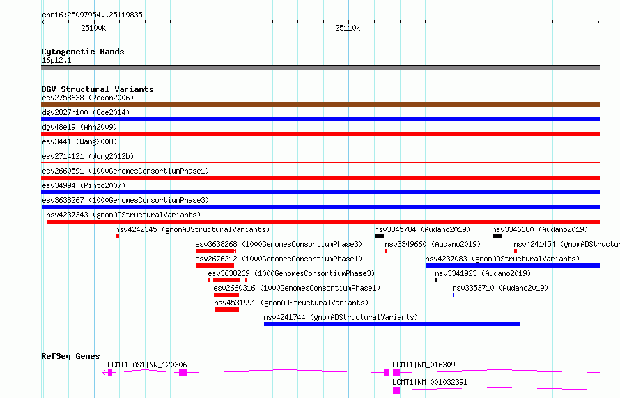 Variant DetailsVariant: esv3638267| Internal ID | 6678365 | | Landmark | | | Location Information | | | Cytoband | 16p12.1 | | Allele length | | Assembly | Allele length | | hg38 | 21882 | | hg19 | 21882 |