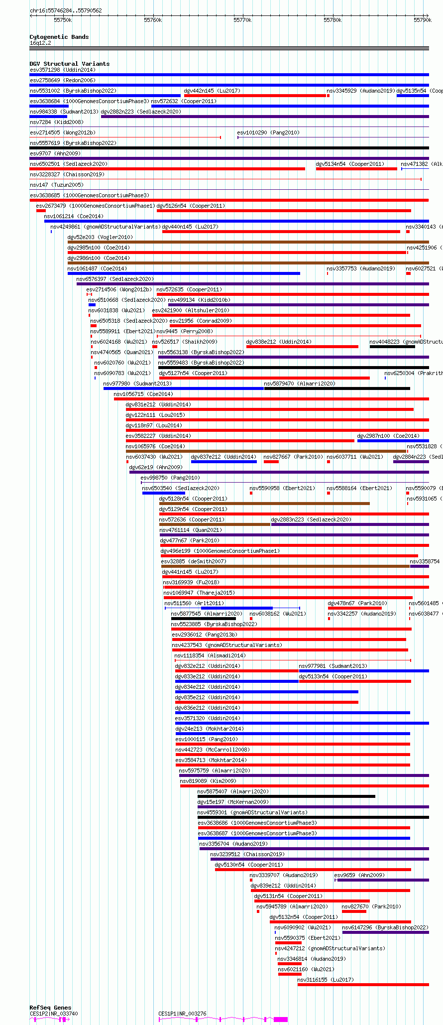 Variant DetailsVariant: esv3638685 | Internal ID | 7025470 | | Landmark | | | Location Information | | | Cytoband | 16q12.2 | | Allele length | | Assembly | Allele length | | hg38 | 44279 | | hg19 | 44279 |