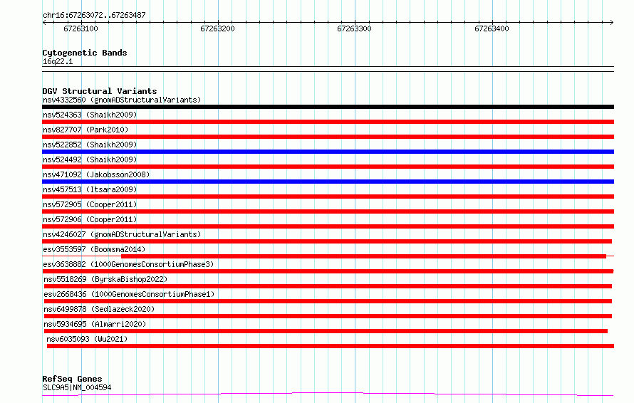 | | Variant Type | CNV loss | | Copy Number | | | Allele State | | | Allele Origin | | | Probe Count | | | Validation Flag | | | Merged Status | M | | Merged Variants | | | Supporting Variants | essv15501417, essv15501406, essv15501414, essv15501408, essv15501419, essv15501425, essv15501412, essv15501409, essv15501407, essv15501405, essv15501418, essv15501415, essv15501422, essv15501420, essv15501421, essv15501410, essv15501424, essv15501413, essv15501403, essv15501411, essv15501404, essv15501423, essv15501416 | | Samples | HG01359, HG01860, NA12400, NA12813, HG01372, HG00323, HG00154, NA20895, HG00157, HG00126, NA20773, NA12716, NA20276, HG01131, HG01685, HG00734, HG00319, HG01085, HG04209, HG01089, HG01631, HG01191, HG01516 | | Known Genes | SLC9A5 | | Method | Sequencing | | Analysis | | | Platform | Multiple platforms | | Comments | | | Reference | 1000_Genomes_Consortium_Phase_3 | | Pubmed ID | 21293372 | | Accession Number(s) | esv3638882
