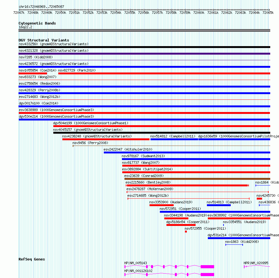 | | Variant Type | CNV loss | | Copy Number | | | Allele State | | | Allele Origin | | | Probe Count | | | Validation Flag | | | Merged Status | M | | Merged Variants | | | Supporting Variants | essv15514846, essv15514854, essv15514857, essv15514847, essv15514841, essv15514844, essv15514849, essv15514842, essv15514836, essv15514839, essv15514853, essv15514843, essv15514855, essv15514837, essv15514840, essv15514852, essv15514856, essv15514848, essv15514851, essv15514850, essv15514838, essv15514845 | | Samples | HG00592, HG00536, HG00452, HG00654, HG00663, HG00632, NA18560, HG02178, HG02138, NA18973, HG00675, HG00598, NA18572, NA18531, NA18632, NA18543, HG00607, HG00656, HG01817, HG00728, NA18968, HG01869 | | Known Genes | HP, HPR | | Method | Sequencing | | Analysis | | | Platform | Multiple platforms | | Comments | | | Reference | 1000_Genomes_Consortium_Phase_3 | | Pubmed ID | 21293372 | | Accession Number(s) | esv3638989