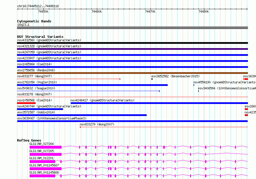 Variant DetailsVariant: esv3639067Internal ID | 6679163 | Landmark | | Location Information | | Cytoband | 16q23.1 | Allele length | Assembly | Allele length | hg38 | 43005 | hg19 | 43005 |