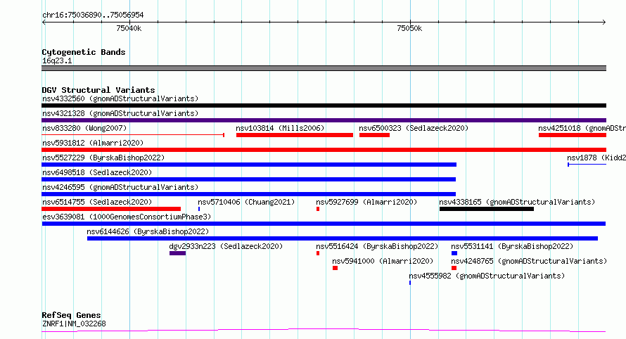 Variant DetailsVariant: esv3639081| Internal ID | 7025864 | | Landmark | | | Location Information | | | Cytoband | 16q23.1 | | Allele length | | Assembly | Allele length | | hg38 | 20065 | | hg19 | 20065 |