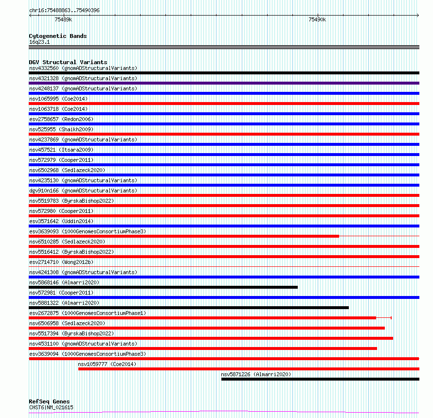 Variant DetailsVariant: esv3639094| Internal ID | 7025877 | | Landmark | | | Location Information | | | Cytoband | 16q23.1 | | Allele length | | Assembly | Allele length | | hg38 | 1534 | | hg19 | 1534 |